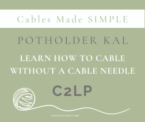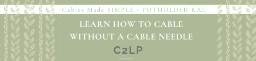 Join the Potholder Pattern Tutorial KAL to learn how to cable the C2LP without a cable needle (cn). This is a FREE Knit-a-long that will help you master the skill of cabling without a cable needle. The third potholder pattern is learning how to cable the C2LP.